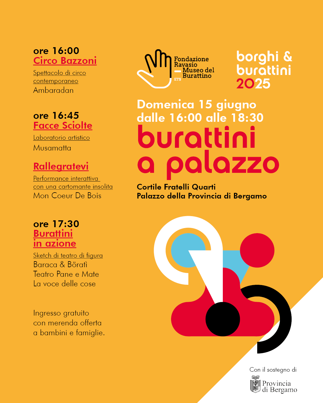 🎭 BURATTINI A PALAZZO – Domenica 15 giugno 2025 Cortile Fratelli Quarti, Palazzo della Provincia di Bergamo 🕓 Dalle ore 16.00 alle ore 18.30 Un pomeriggio speciale per grandi e piccoli vi aspetta domenica 15 giugno, nella splendida cornice del Palazzo della Provincia di Bergamo. Il programma: 🎪 Ore 16.00 – “Circo Bazzoni” di Ambaradan Uno spettacolo comico, poetico e imprevedibile, per far sorridere tutte le età. 🍪 Al termine dello spettacolo, offriremo a tutti una…